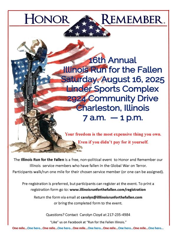 2025, at Linder Sports Complex, 2924 Community Drive, Charleston Illinois. Participants can walk/run any time between 7 a.m. and 1 p.m.